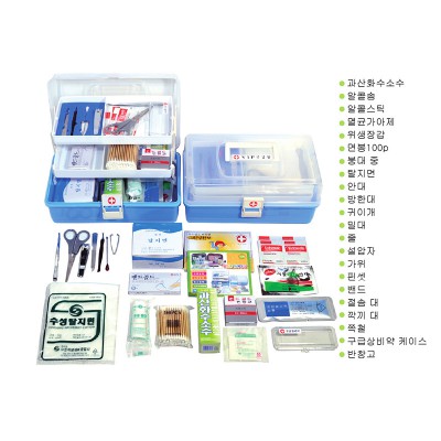 | 기타사항 | 과산화수소수/알콜솜/알콜스틱/멸균가아제/위생장갑/면봉100p/붕대 중/ 탈지면/안대/방한대/귀이개/밀대/줄/설압자/가위/핀셋/밴드/절솜 대/ 깍끼 대/쪽철/구급상비약 케이스/반창고 |