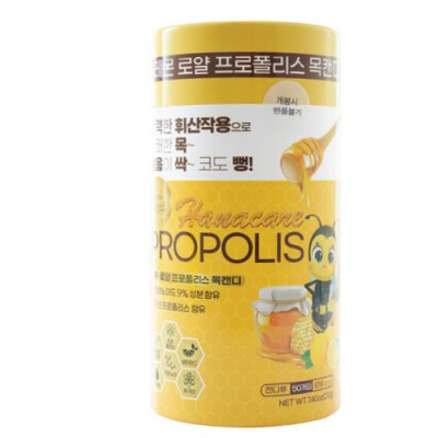 | 기타사항 | •210g(100g당 389㎉) •플라보노이드 9%성분, 호주산 프로폴리스 함유 •강력한 휘산작용, 상쾌한 목, 졸음이 싹~, 코도 뻥! |